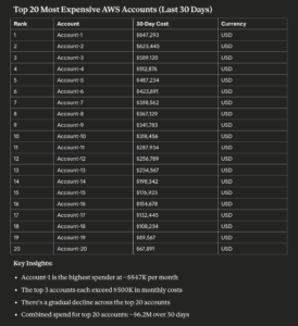 - “Show me my most expensive services in the last 30 days across developer accounts.”